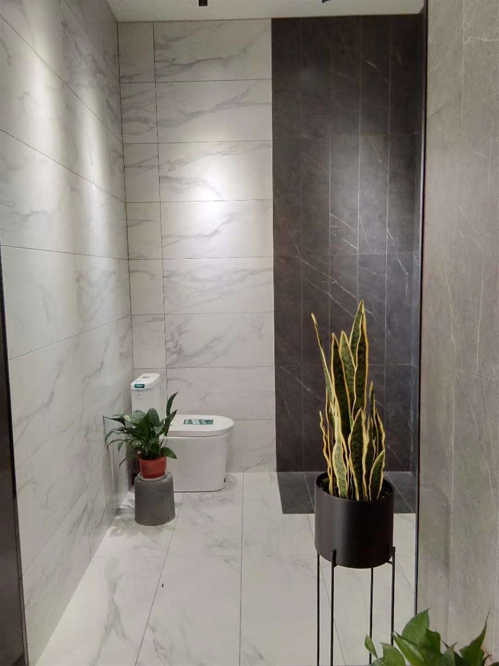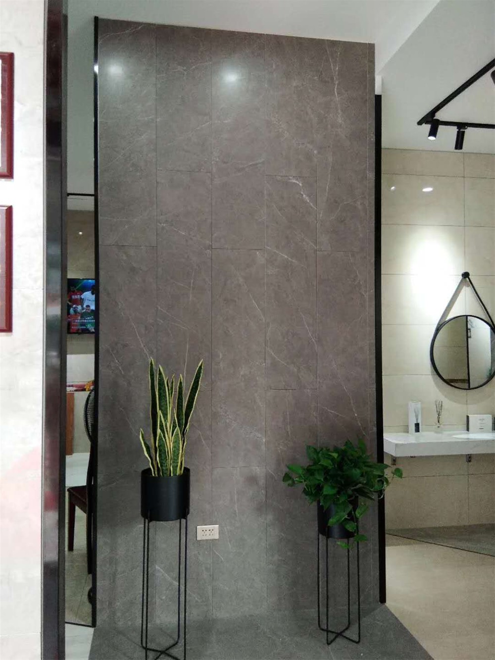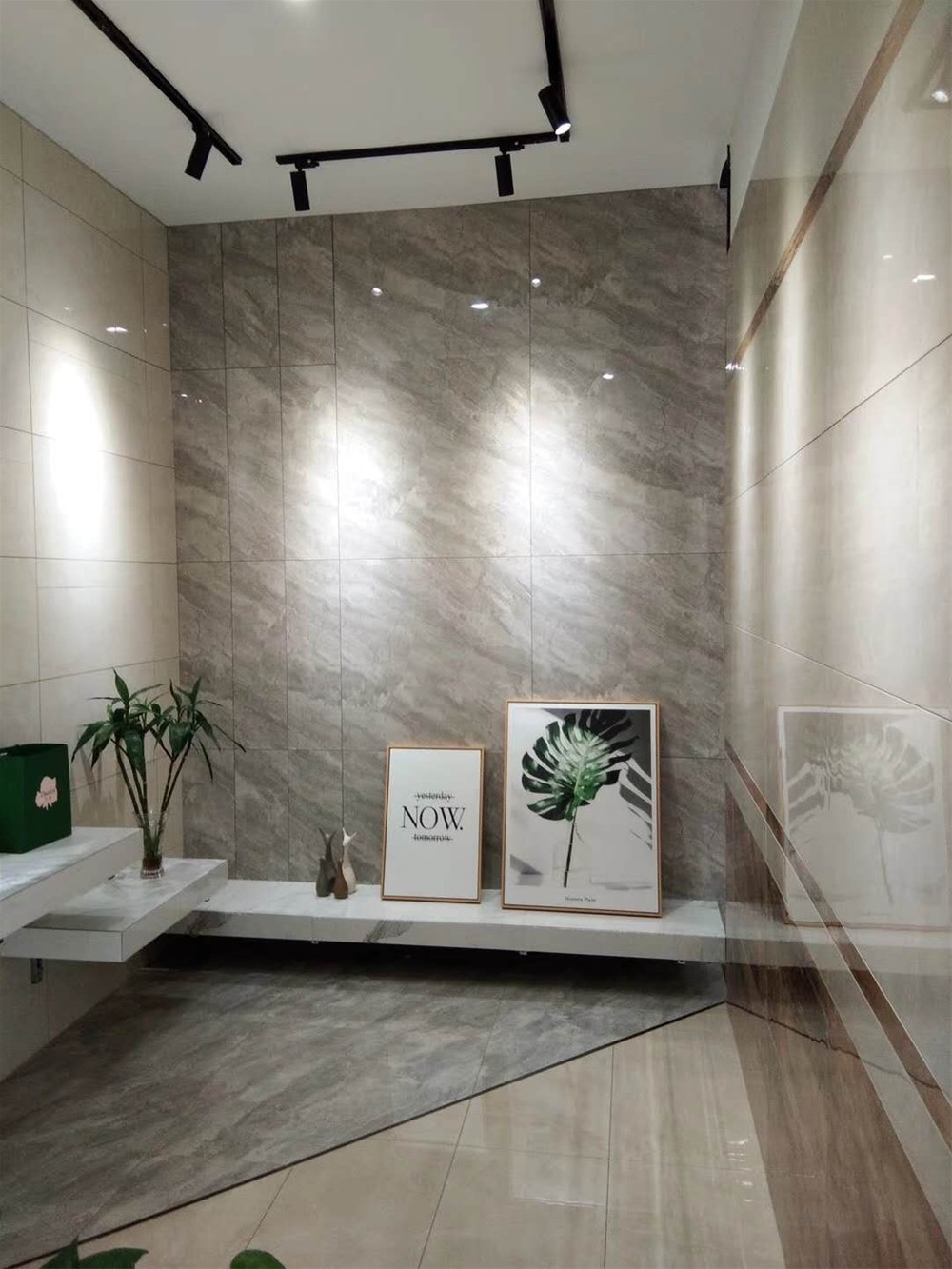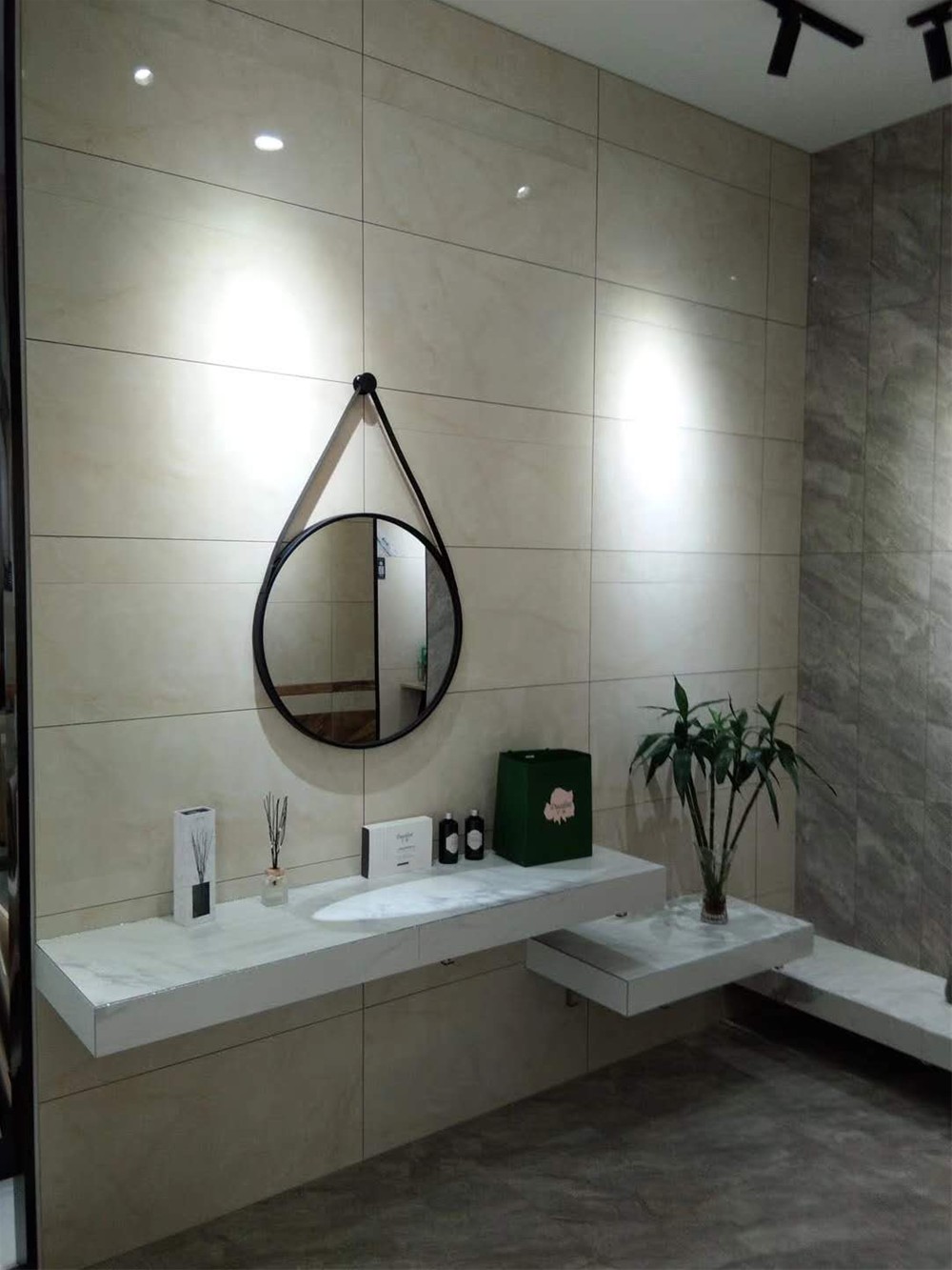 這是一個通體大理石瓷磚的模擬間,模擬了洗手間/客廳背景牆的立體空間,通過灰色和米色的冷暖色搭配,體現了整個空間的層次感。