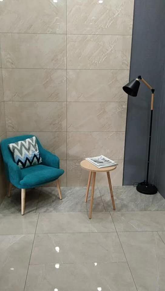 這是15°緞光釉鋪設的現代風格模擬間,沒有更多造型,簡單的瓷磚切割鋪貼,優雅大氣的瓷磚紋理運用錯位鋪貼而成的牆麵。