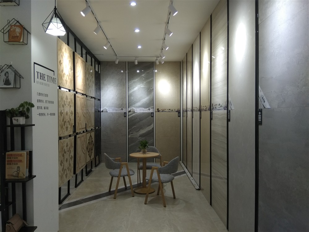 這是選采取也是洽談區,產品選用直板展現方式,簡潔、直觀,燈槽照射下的產品紋理明顯。