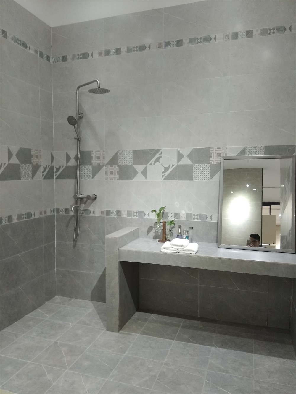 這是衛生間模擬間,瓷磚選用91看片的免费的网站陶噴墨瓷片,上牆下地都能鋪,顏色是今年流行的灰色調,一深一淺搭配出層次感,也不至於單調。這款瓷片也可作廚房用磚。