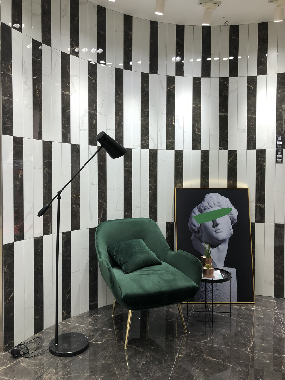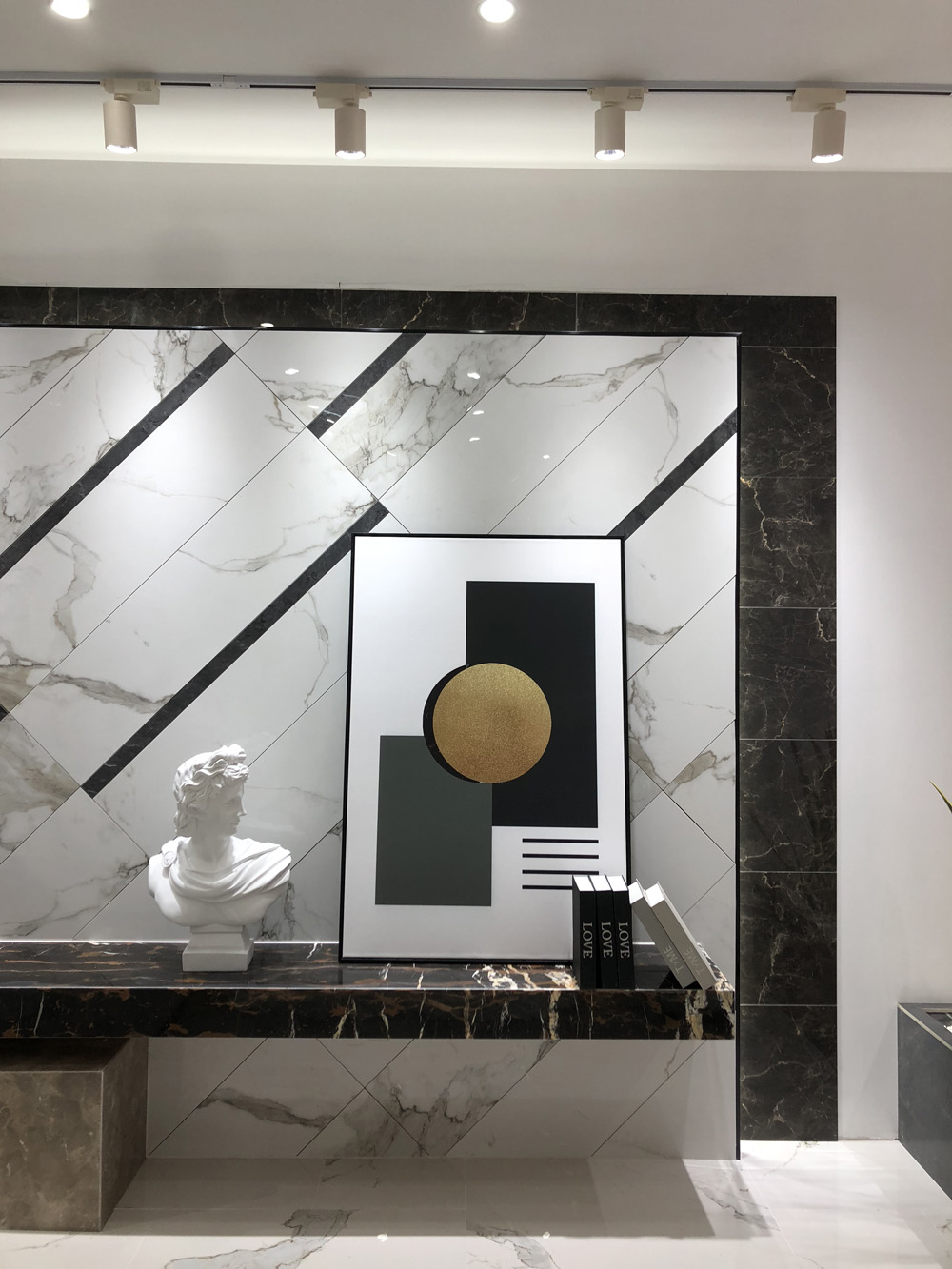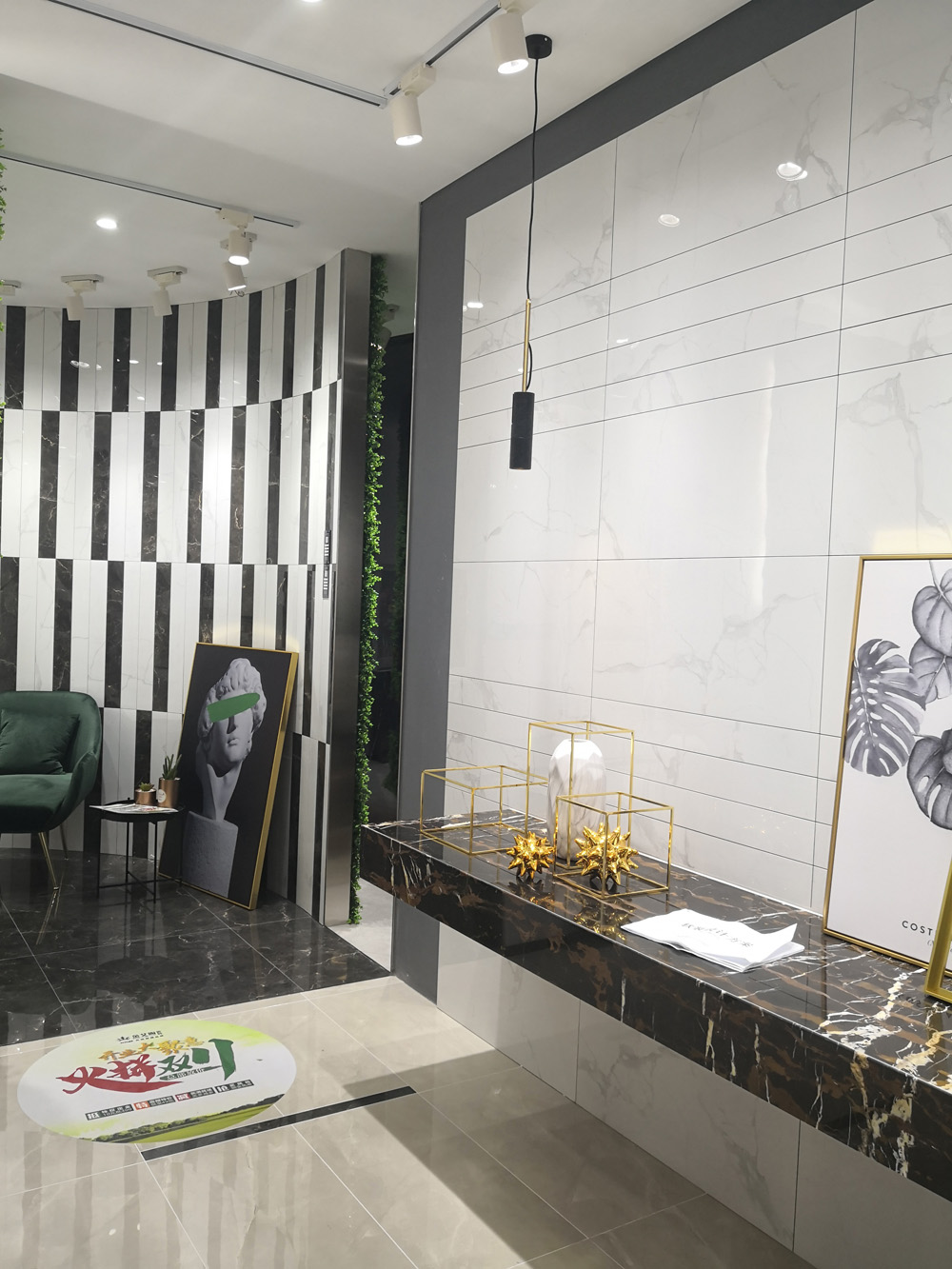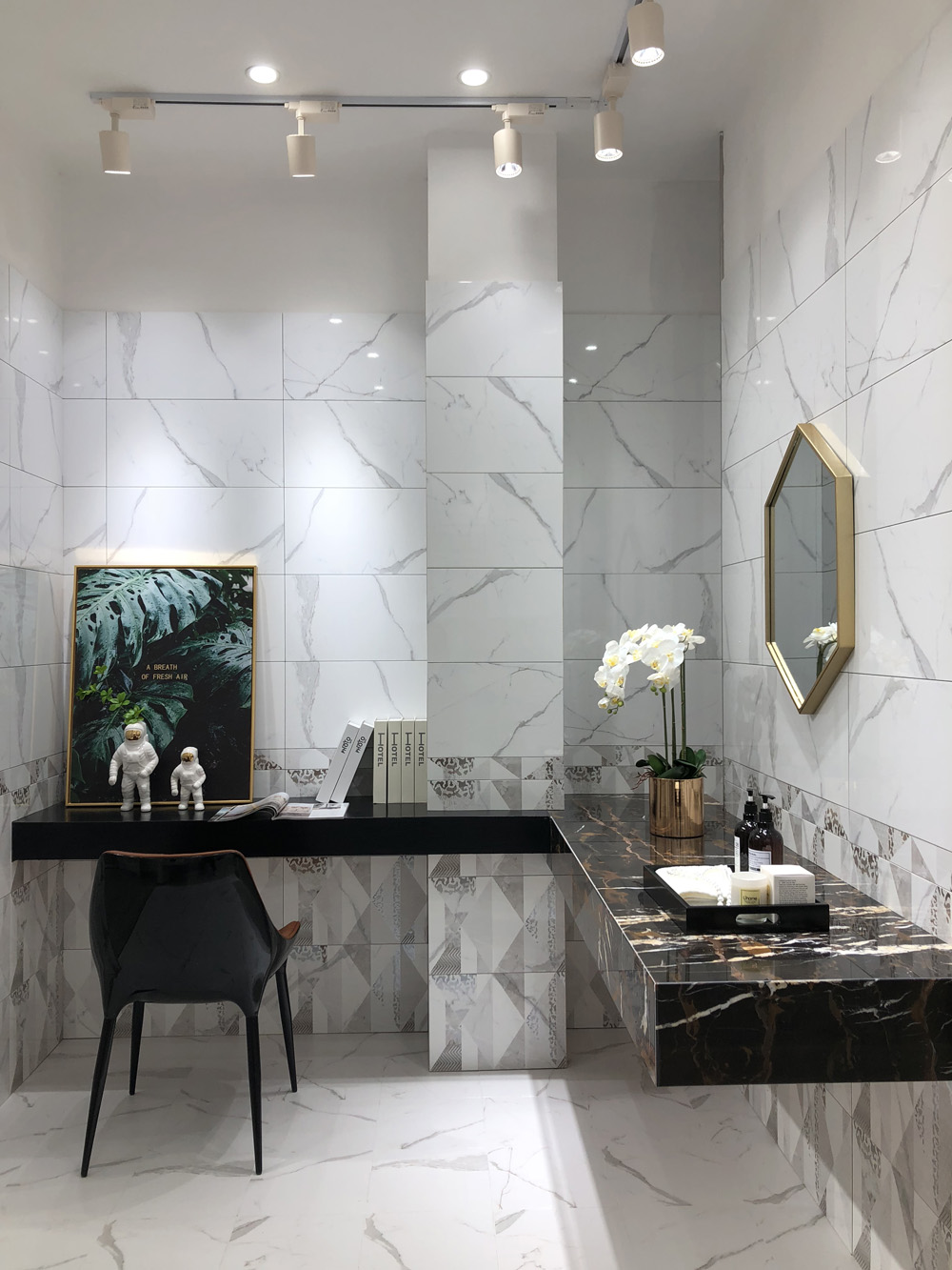 這是輕奢風格陽台、書房的模擬間,由通體大理石鋪貼的牆麵個性藝術,搭配金屬軟裝營造出輕奢的質感。現在很多流行的咖啡廳參照這樣的設計來吸引消費者。