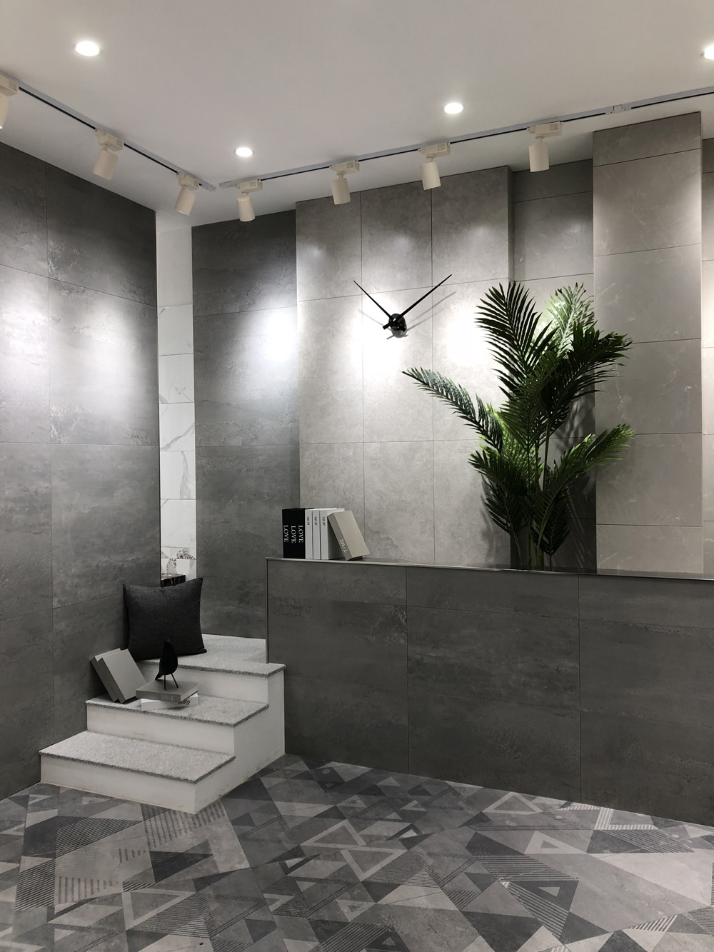 這是91看片的免费的网站陶浙江嵊州青春館的前台,由灰色九麵通體大理石鋪貼的背景牆,形象台由緞光釉卡拉卡白鋪貼而成,可塑性非常強的一款產品。簡潔大氣的前台延續了青春館的現代簡約風格。