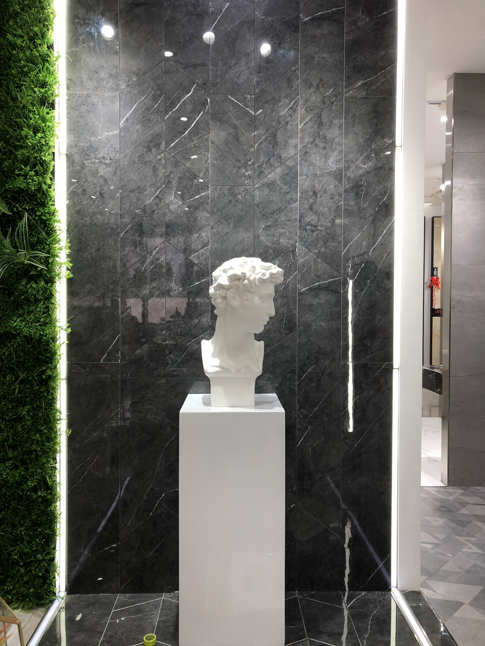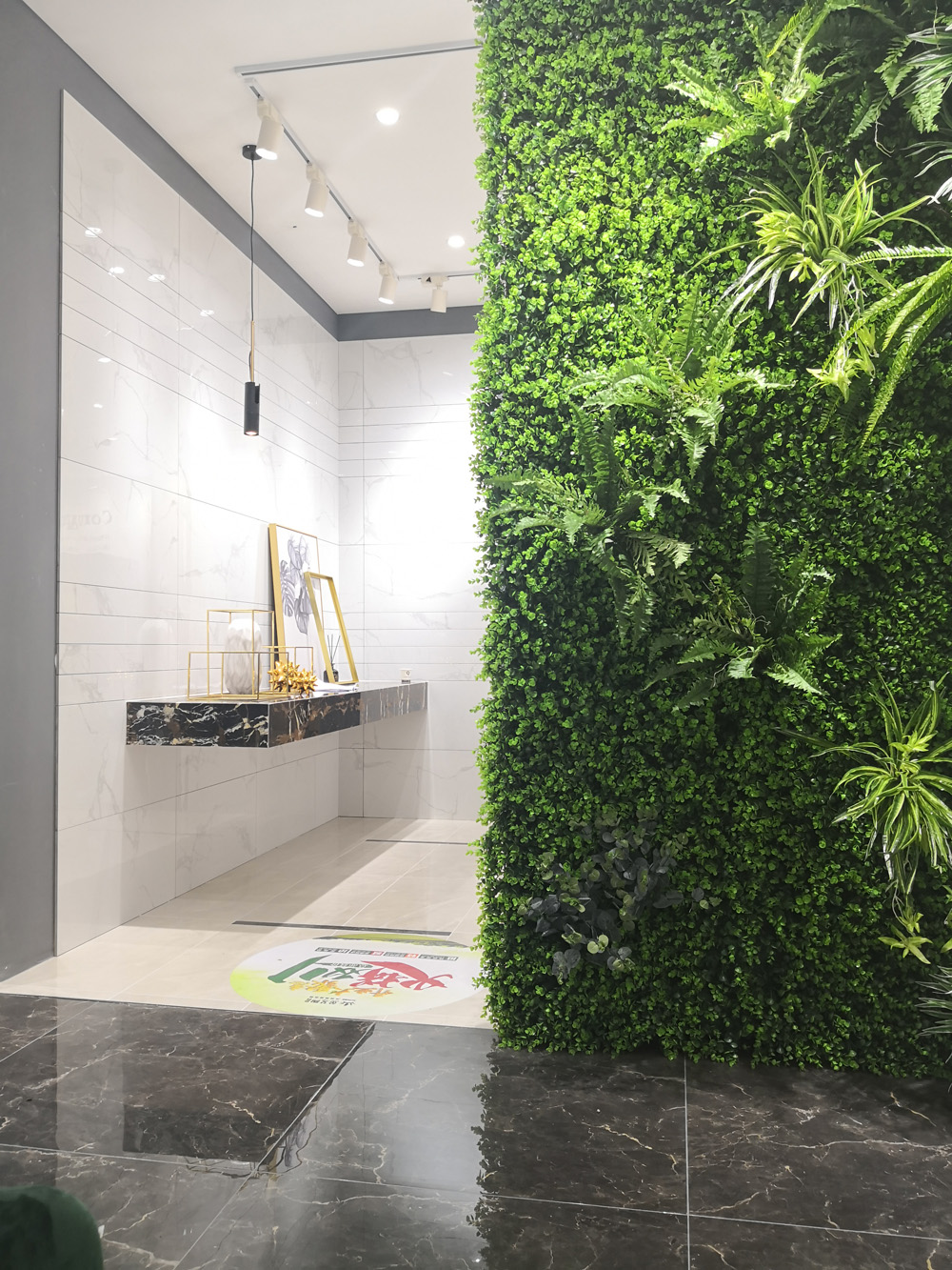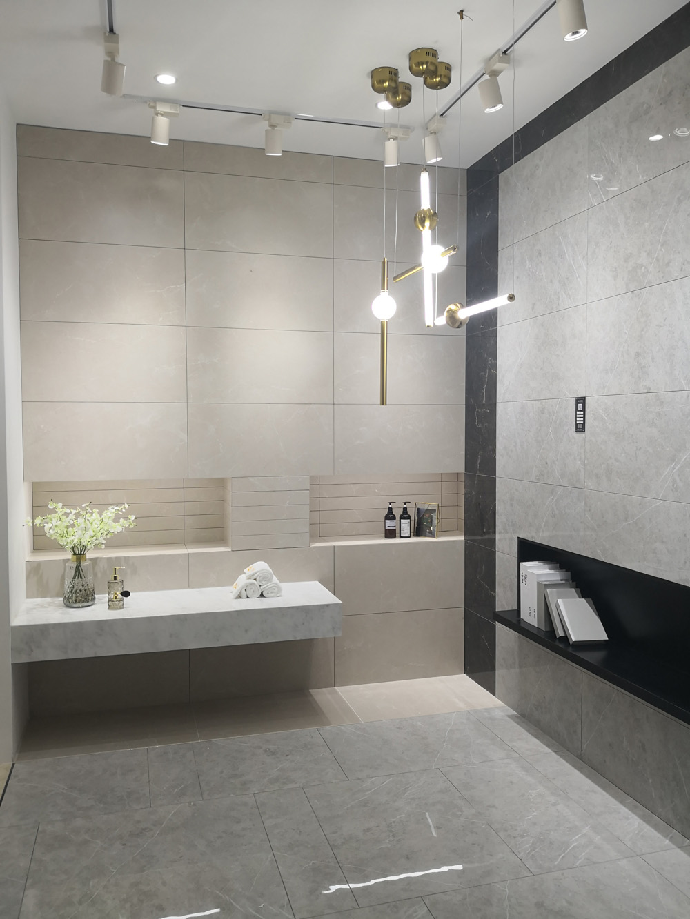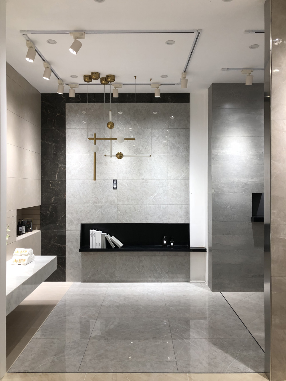 這是選材區,產品選用直板展現方式,簡潔、直觀,地麵選用九麵通體大理石魚肚白進行鋪貼,白色地麵能更好地突出其它產品的顏色和紋理,加之槽燈照射,呈現產品逼真自然的紋理。