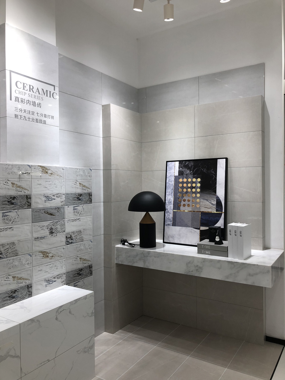 這是由噴墨瓷片鋪貼的書房,突出的牆麵一堵是純色係、一堵是由花片鋪貼而成,讓空間有更多的變化的同時消費者也不會產生審美疲勞。