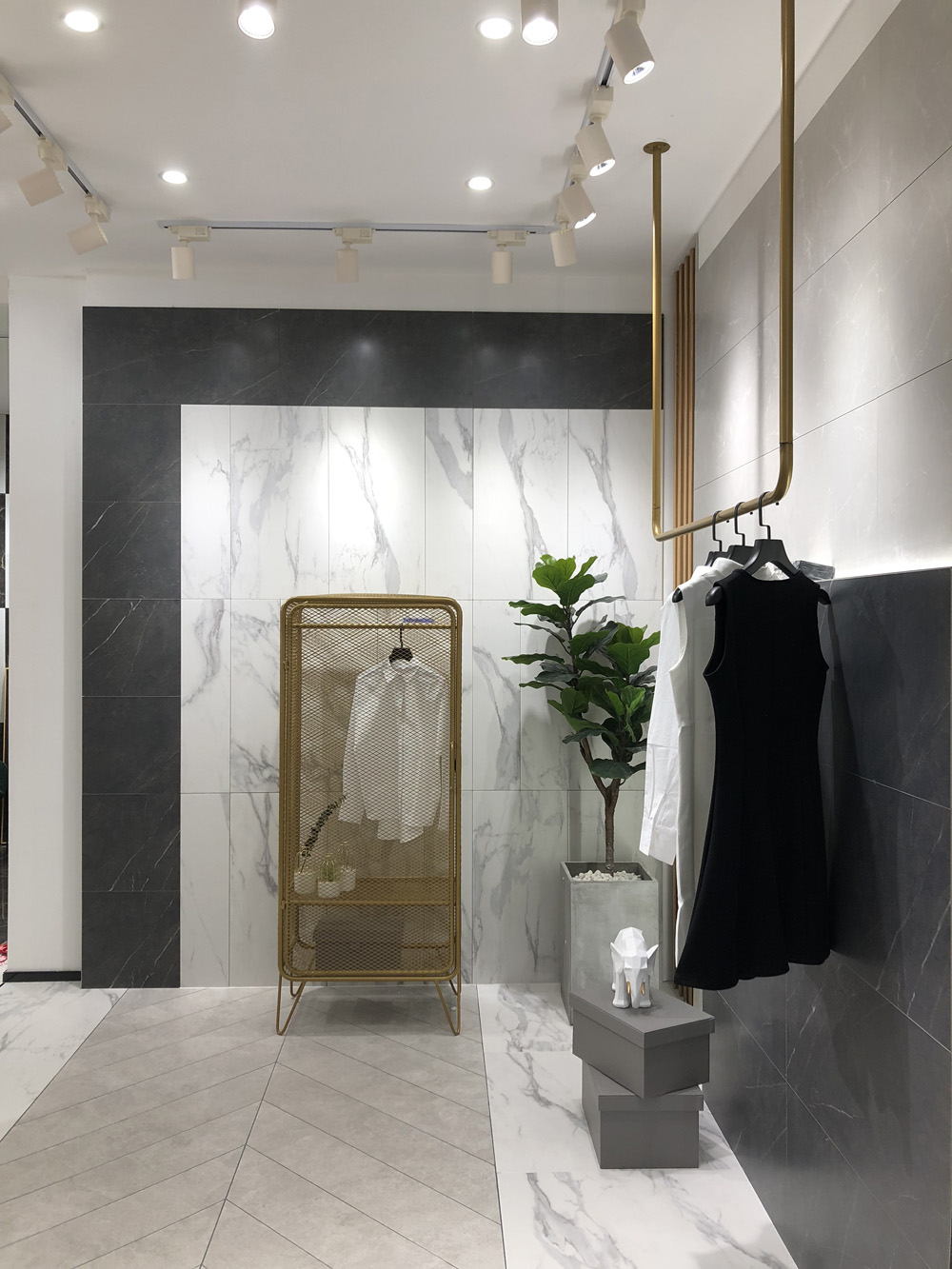 這是九麵通體大理石鋪貼的現代簡約衣帽間,不同規格顏色的產品切割拚接出時尚個性的牆麵,另一麵牆是簡單的鋪貼,刪繁就簡。