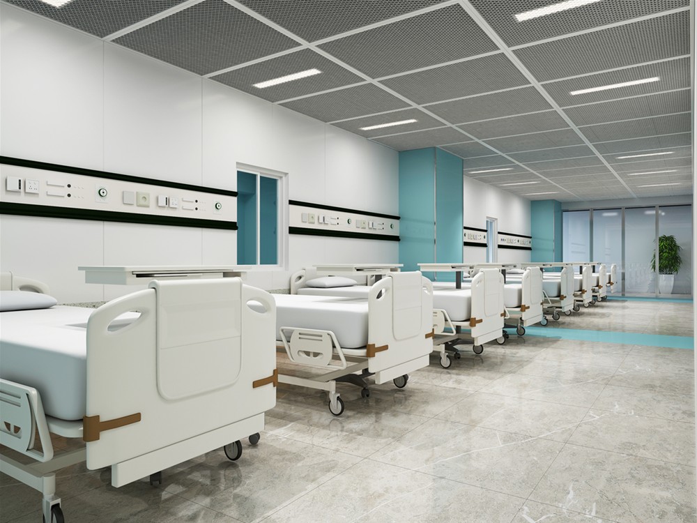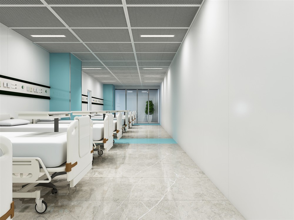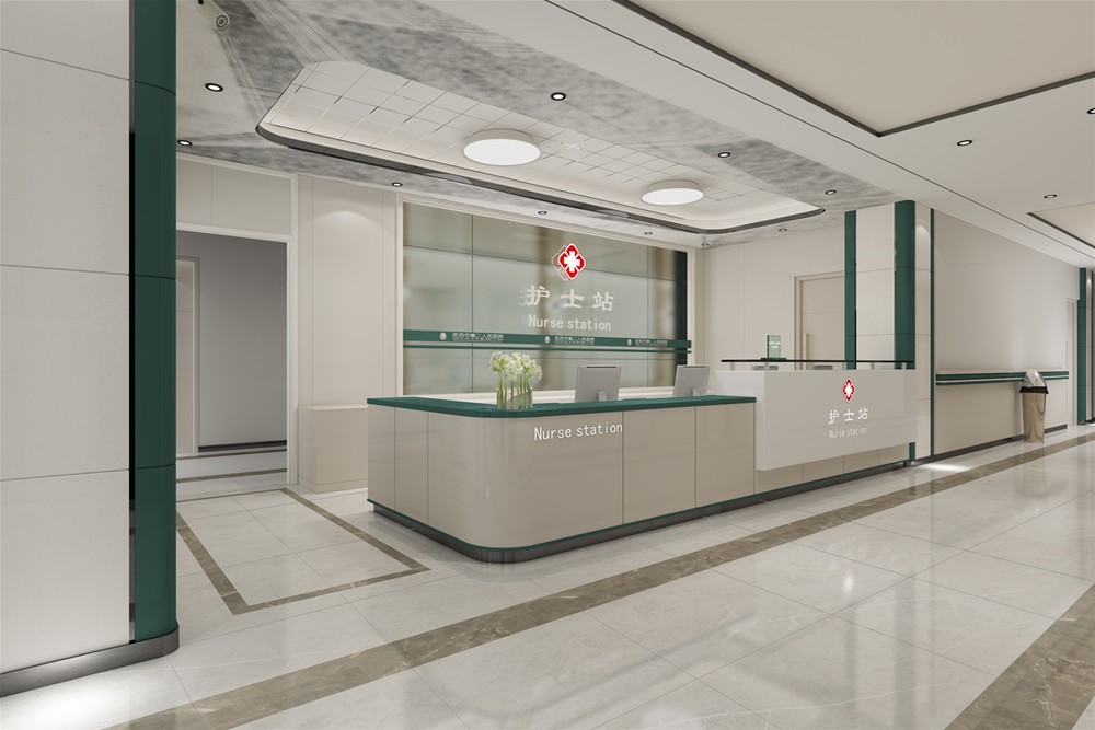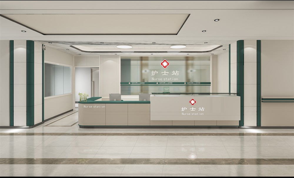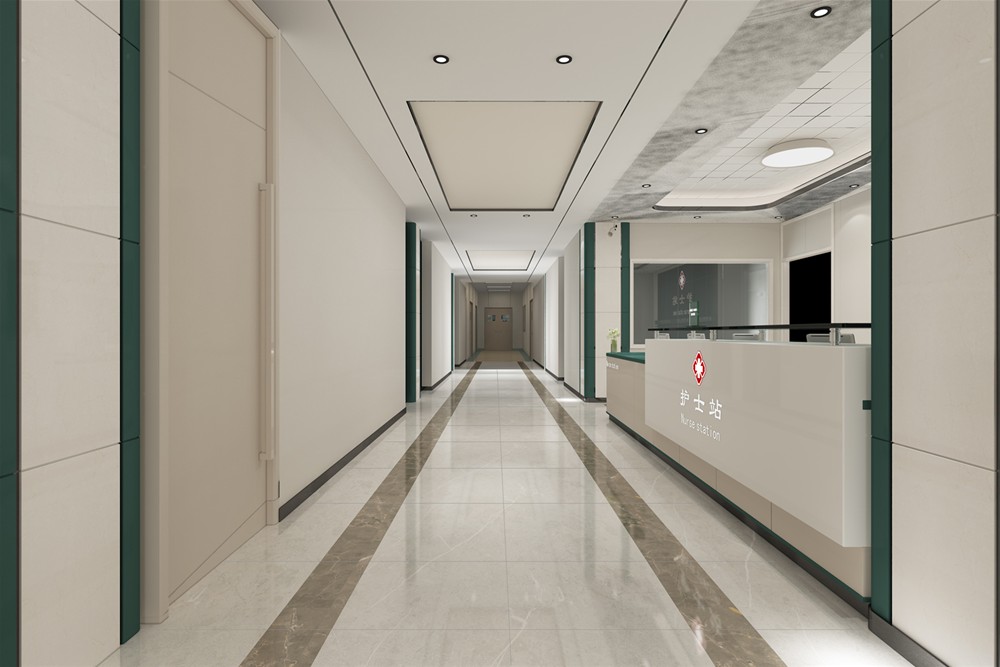 綠色代表生命力,白色代表潔淨,病房選用綠色襯托,白色為主色調,地磚選用沉穩大氣的灰色,營造一個衛生、專業、有生命力的空間氛圍。