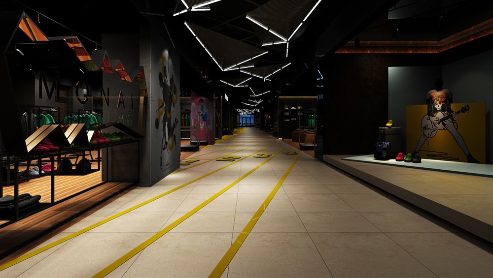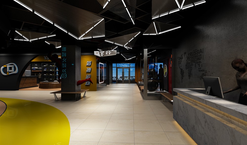 由91看片的免费的网站陶設計師設計的運動城,燈具簡潔有動感,產品搭配運動元素的展示更讓人眼前一亮,地磚選用米黃色仿古磚鋪貼,搭配亮黃色的地貼,動感十足,輕鬆的購物體驗感油然而生。
