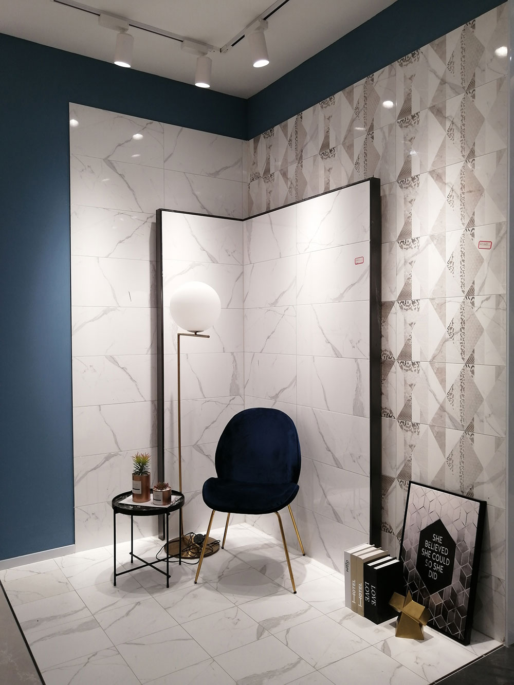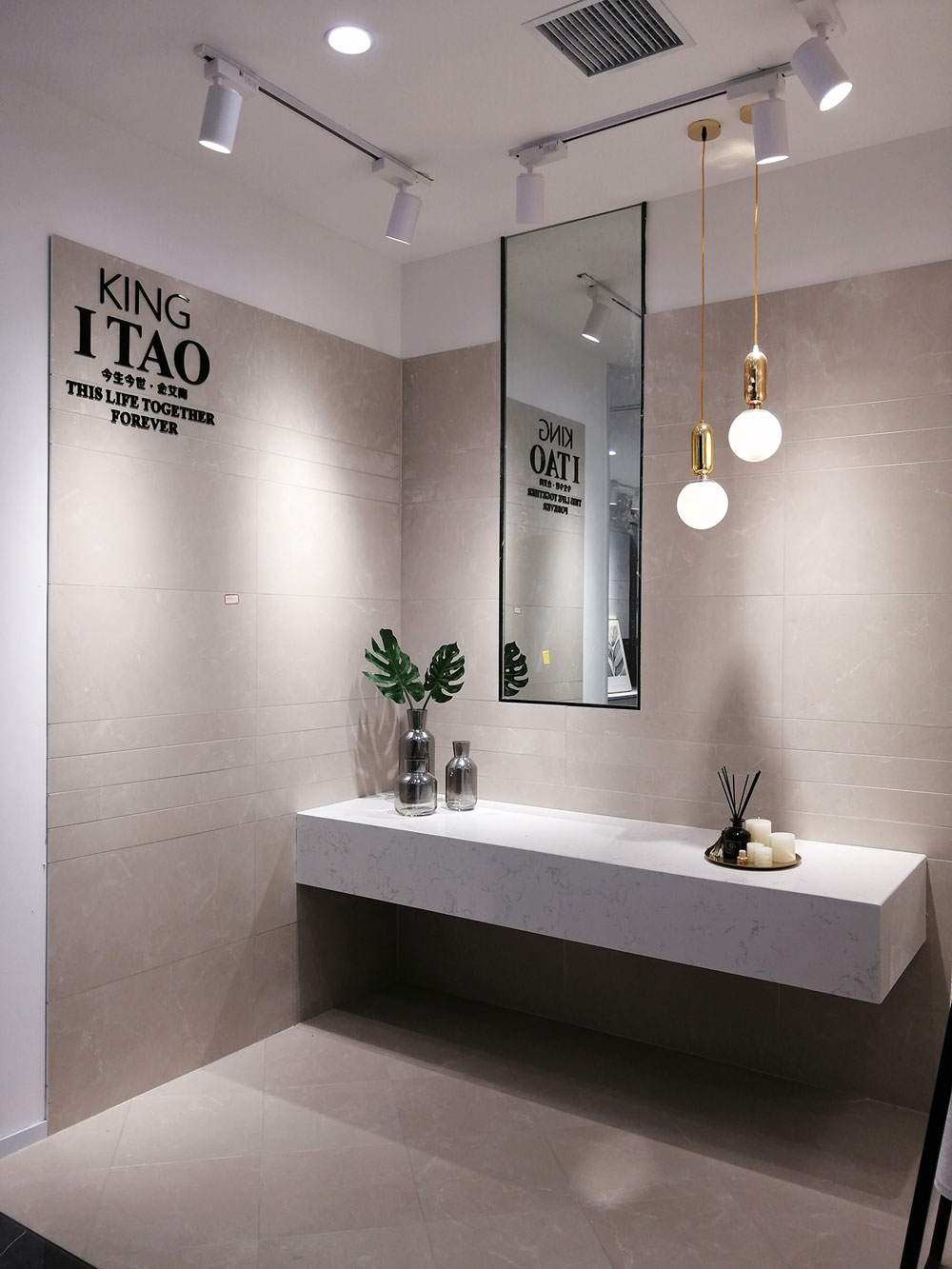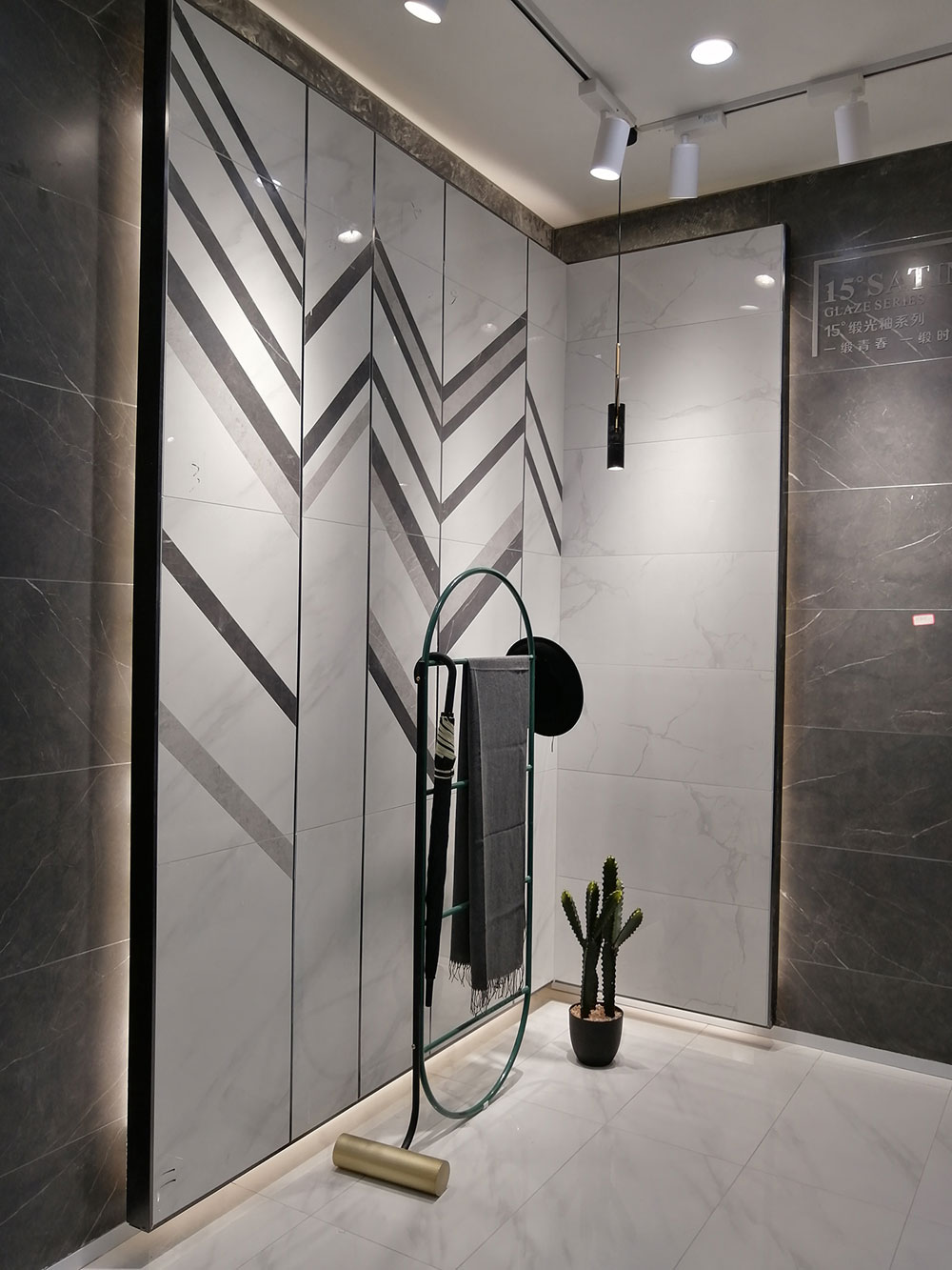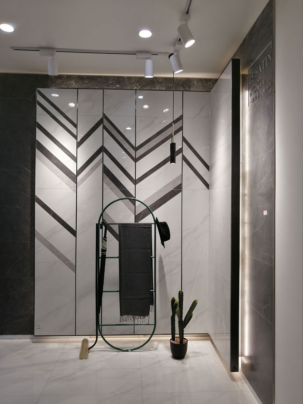 牆麵是由艾釉石KYP8101水刀切割鋪貼,黑白灰對比強烈,空間層次分明,區別於傳統的直鋪,彰顯年輕人個性、大膽的需求。白色作為主色調,最有包容性的顏色,可以和任何顏色進行搭配,在這個空間,白色與灰色、黑色讓整個空間富有藝術感和時尚感。