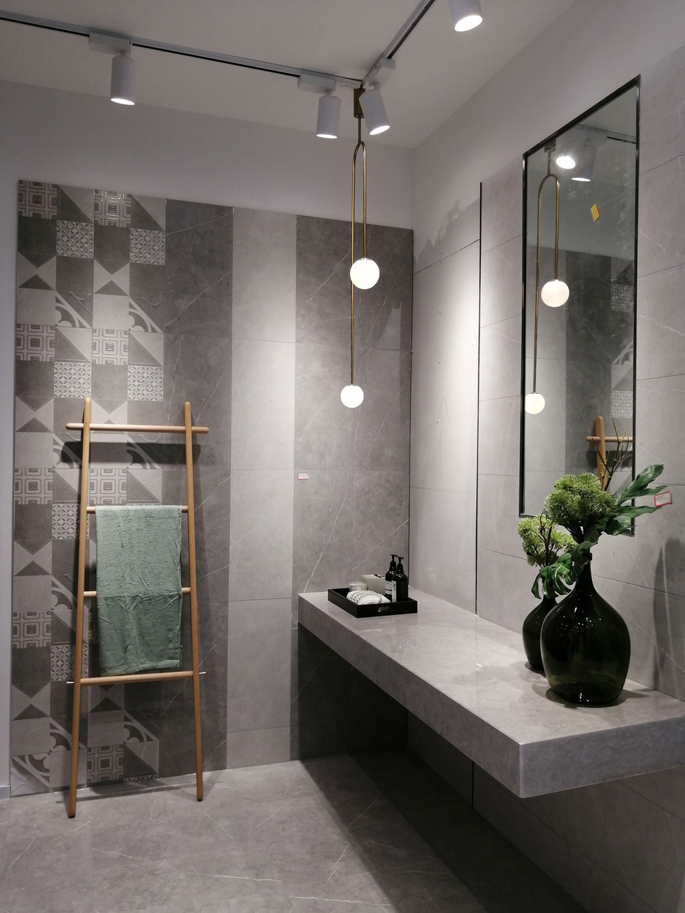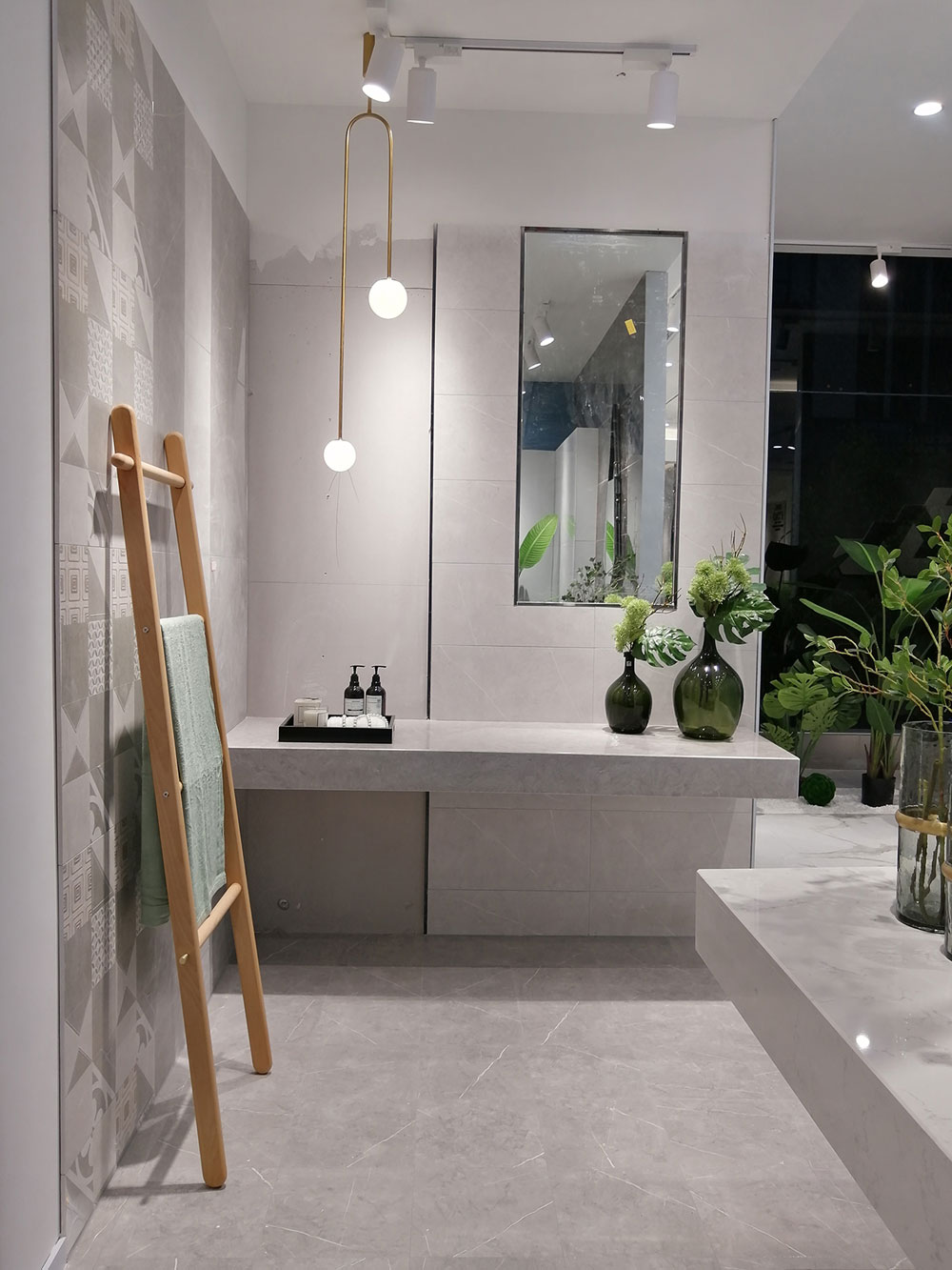整個空間選用的是300*600規格的噴墨瓷片KPM36085,空間營造的是極簡的感覺,灰色也被稱為“智慧色”!整個空間采用灰色作為主色調讓整個空間顯得十分舒適,在搭配上植物的綠色、支架的黃色讓整個空間完美融合!任何一個空間都需要一個亮點,不然整個空間都會顯得空洞、乏味,在這個空間中,牆麵的花紋讓視線更加聚焦,是整個空間的一大亮點。