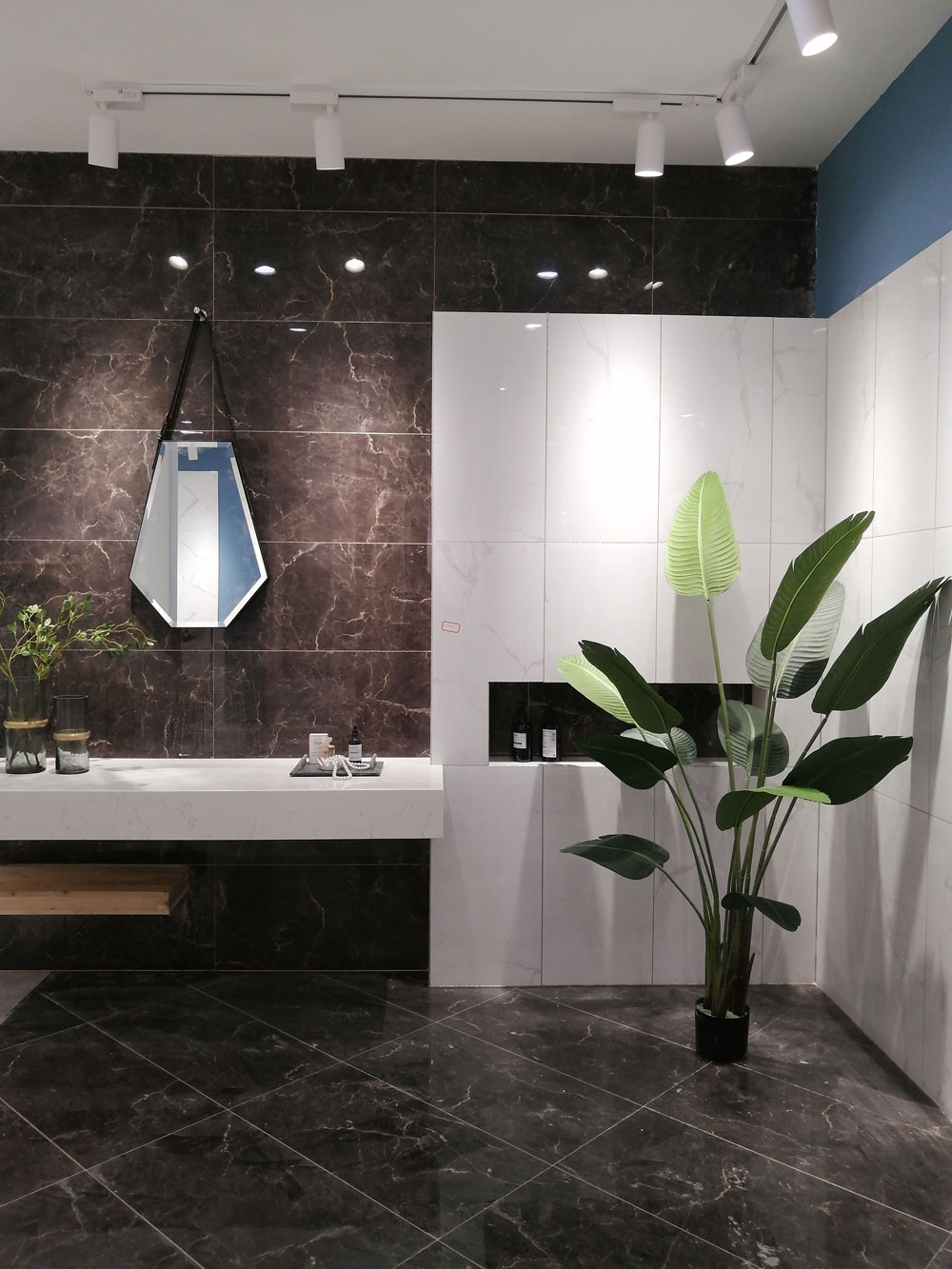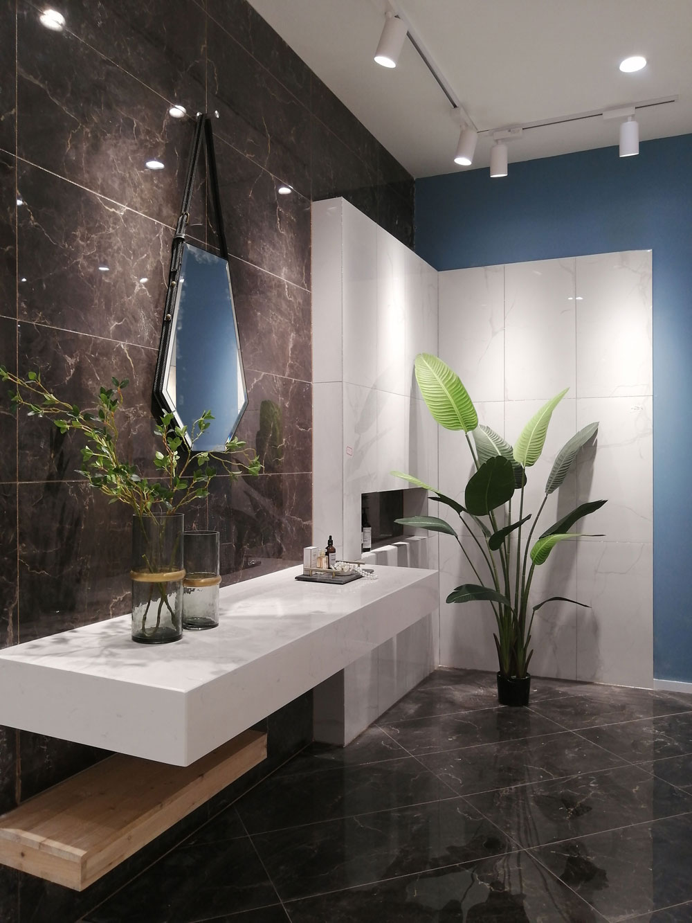 通體大理石達曼深咖KTB9818/雪花白KTA9821切割成400*800鋪貼,牆麵與地麵選用同一款磚,營造和諧統一的空間氛圍,右邊牆麵選用白色瓷磚鋪貼,使得整個空間層次分明,綠植點綴的空間盡顯生機與活力。
