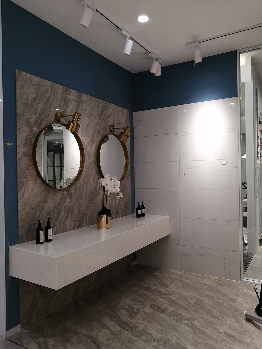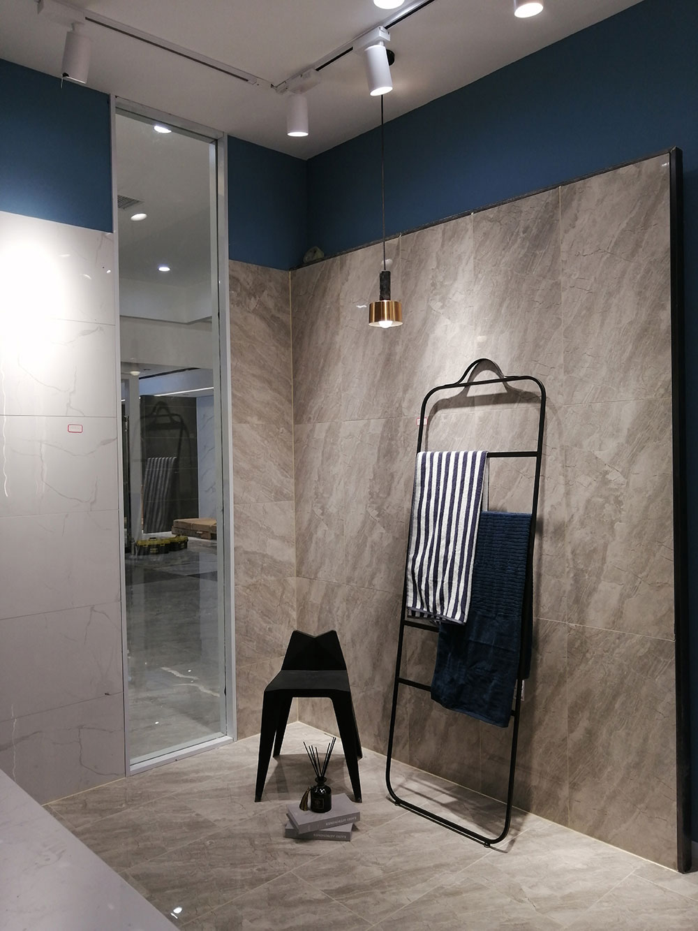 通體大理石瑪雅灰KTA8301鋪貼,整個空間以灰色作為主色調,灰色是最近家裝最流行的顏色,自帶高貴與品味,優雅沉著,磚麵紋理大膽粗獷,營造沉穩大氣的空間氛圍,牆麵與地麵選用同款產品,營造空間協調統一的空間。