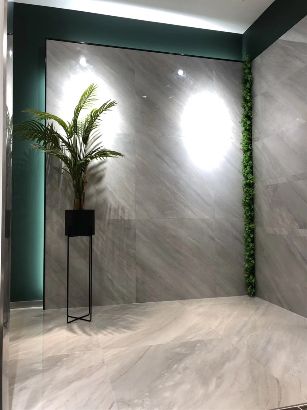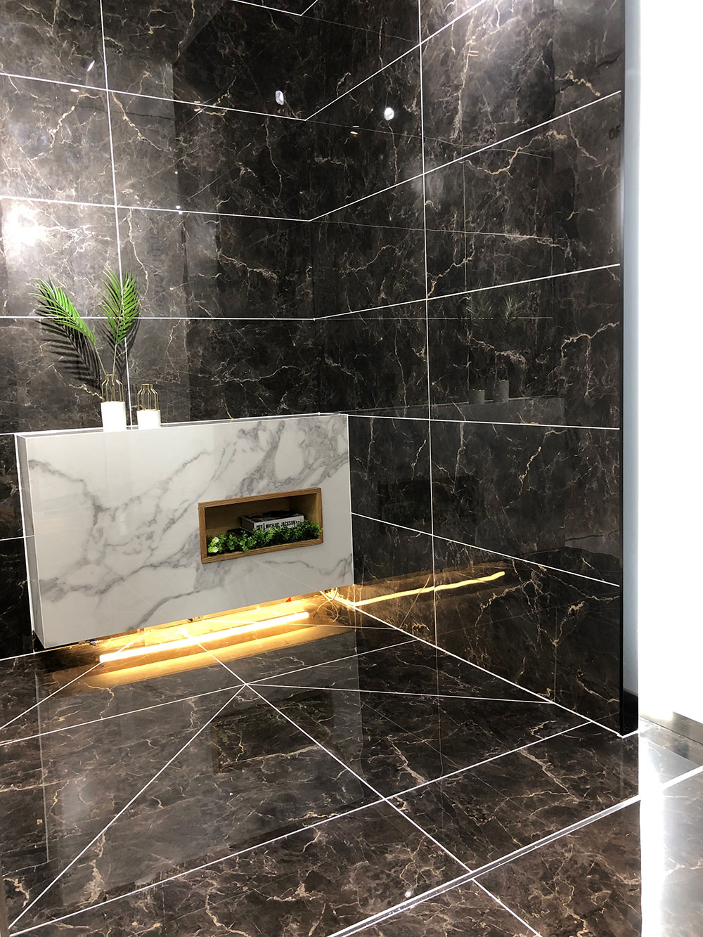 這是91看片的免费的网站的前台,背景牆由灰色通體大理石KA9M009羅馬布裏卡通鋪,把木紋條作為空間的間隔,前台選用白色鑲嵌銀色大理石紋,整個空間散發著簡潔優雅的氣息。凸顯簡約的91看片在线观看免费定位。您家地磚和背景牆同樣適合選用這款磚。