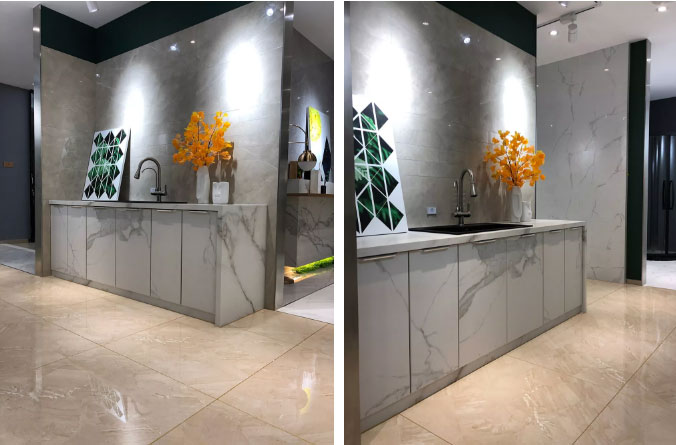 這是現代簡約風格廚房,牆麵由艾釉石KYP8118通鋪,地麵由KYP8069格蘭石通鋪,米黃色與淺灰色搭配形成對比,給人視覺上強烈的衝擊力。