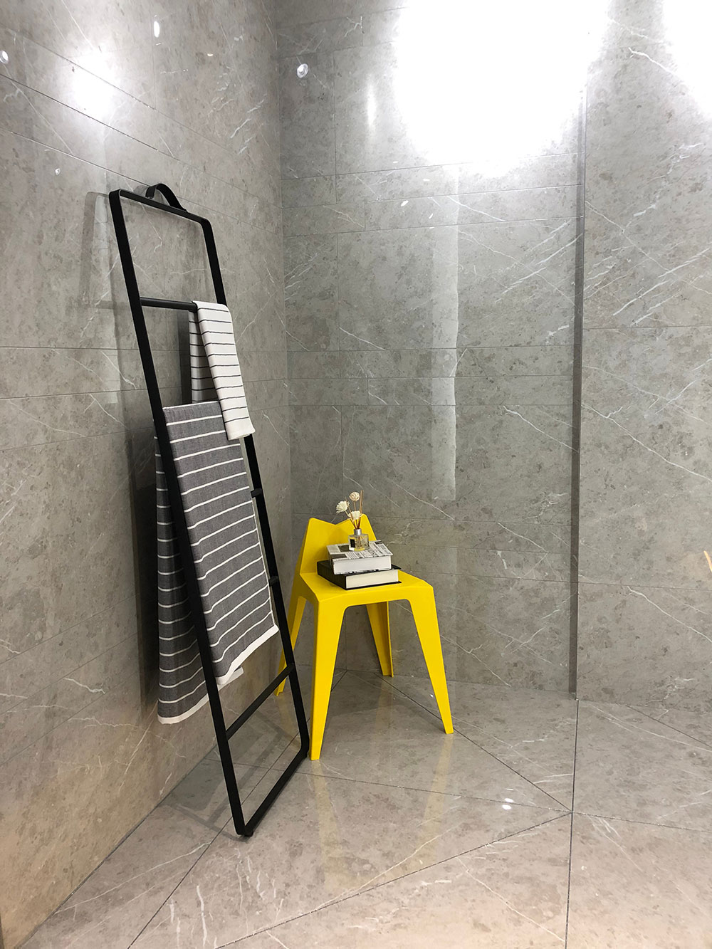 這是由通體大理石KTA9819卡門灰鋪貼的衣帽間,整個空間以灰色作為主色調,灰色是百搭色,軟裝選用黃色,牆麵凹凸有致,營造視覺衝擊力,灰色作為近幾年的家裝主流色,運用於電視背景牆、全屋地麵都是不錯的選擇。