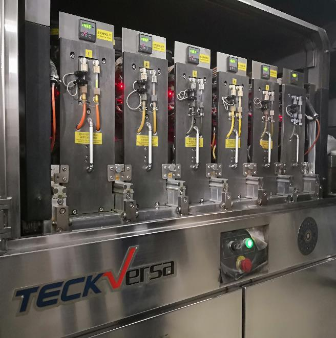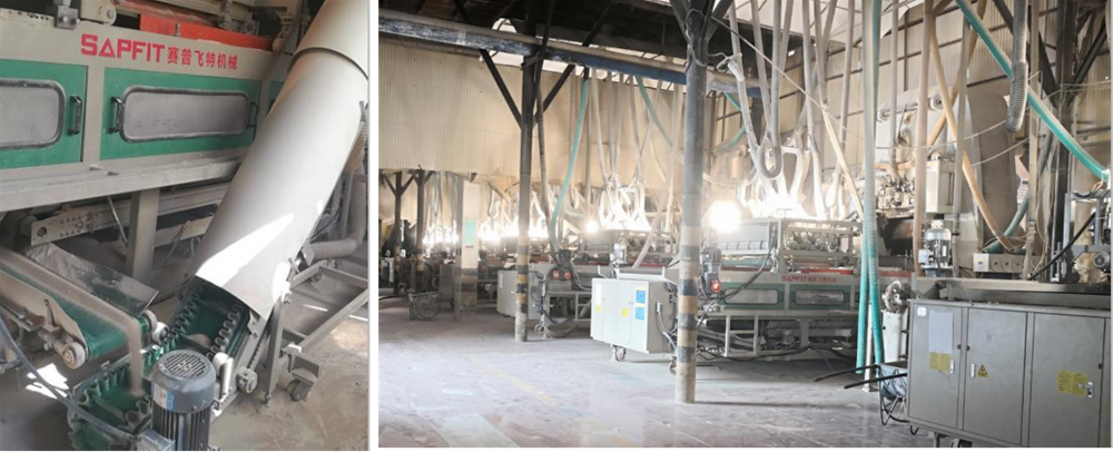 布料車很大程度影響著通體大理石的逼真程度。有色粉料和純色粉料需經過專門設計的布料才能形成有紋理的坯體。布料有專門的布料車, 也叫布料機。布料時可通過控製各輥筒的下料時間來控製輥筒對應粉料的下料量,而有色粉料在輥筒中 的排列順序決定了最終形成紋理的色調分布。因此,在生產的時候,要根據不同的產品調 整輥筒類型、下料時間、色粉種類以及色粉在輥筒中的排列順序,以使坯體形成與產品相 對應的設計紋理。