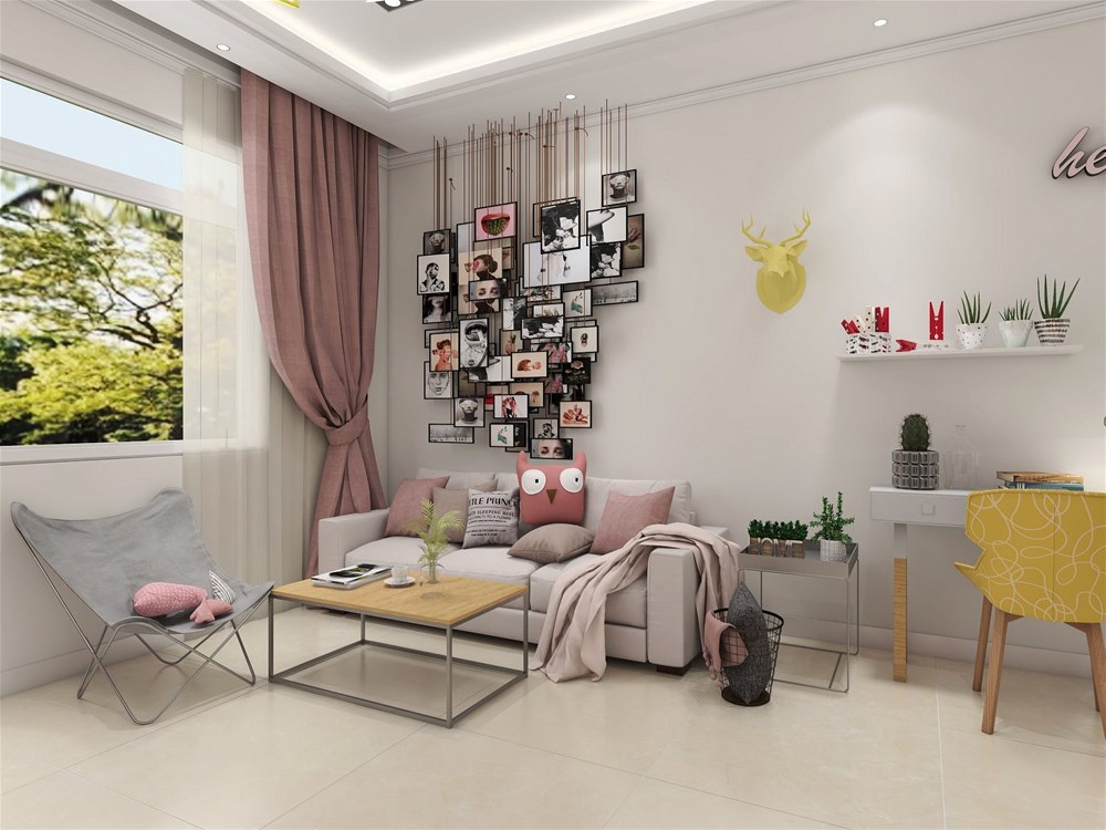 粉色沙發與粉色窗簾相呼應