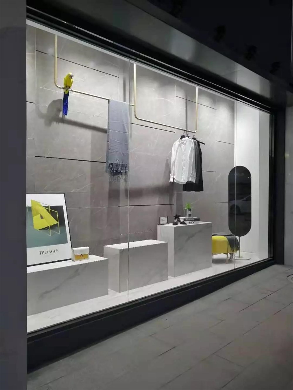 15°緞光釉的灰色調自帶迷人的高貴氛圍,結合白色的卡拉拉白,打造出高端商場的購物氣氛,就連貨架上的貨物都顯得那麽的珍貴。