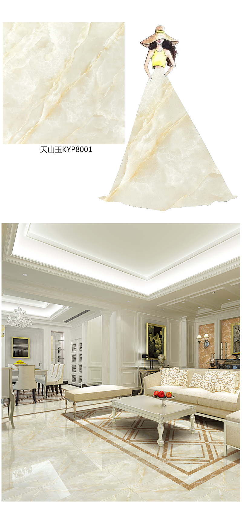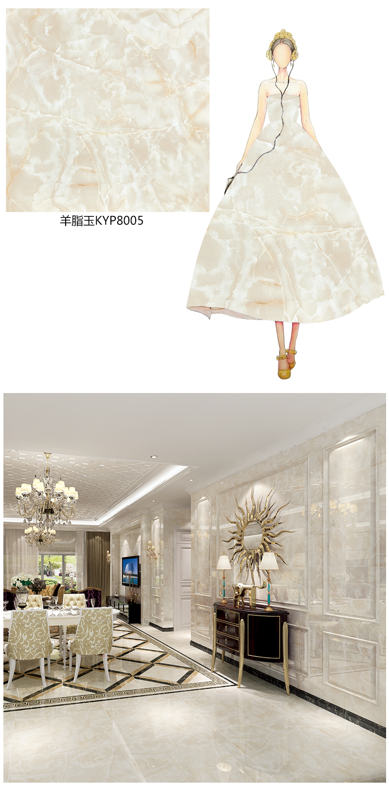 取材自天山山脈的玉石,翡翠般的光澤,寶石般的硬度,且種質細膩潤澤,色調柔和,聲音清脆,紅光內蘊。延續了條狀紋理縱貫板麵的特性,白光度極好,微晶質麵又極大的提升磚麵立體感,加上調以溫和的土黃色澤,使磚麵自然清澈,紋理絲絲入扣,賦予大理石岩層肌理生機,營造出自然、潔淨的生活空間。