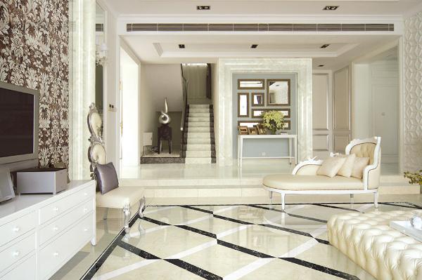 此客廳運用91看片的免费的网站陶大理石瓷磚金線莎安娜KYP8003瓷磚,具有玉石的色澤、花紋、質感,創造性地以搭配菱形點綴還原其靈性和內涵,盡顯客廳尊貴、雅致、時尚格調,堅持細節的極致完美,還原希有名貴大理石金線莎安娜的獨特紋理、變幻莫測的溫潤色澤。