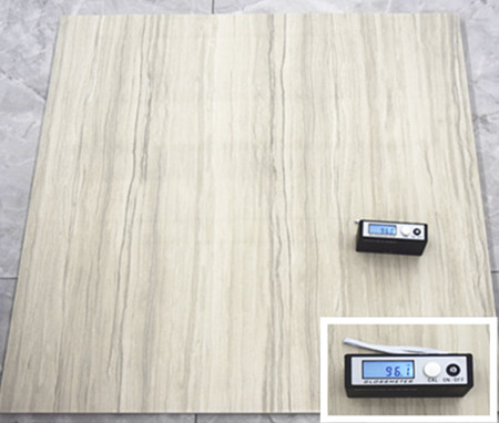 測評瓷磚必不可少的一項環節就是光澤度的測試,測評人員使用專業的光澤度儀,在瓷磚表麵移動不同的位置測試,最後結果為多個位置光澤度的平均值。測試結果為96.1度,光澤度可以說是讓人意想不到的好。