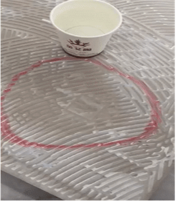 為了檢測這款瓷磚是否夠防滑,測評人員將瓷磚傾斜放置,並在瓷磚表麵灑滿水,並將裝滿水的紙杯放置在瓷磚表麵,靜候幾分鍾,紙杯在瓷磚表麵並沒有出現滑行現象,說明這款瓷磚的防滑性能極好。