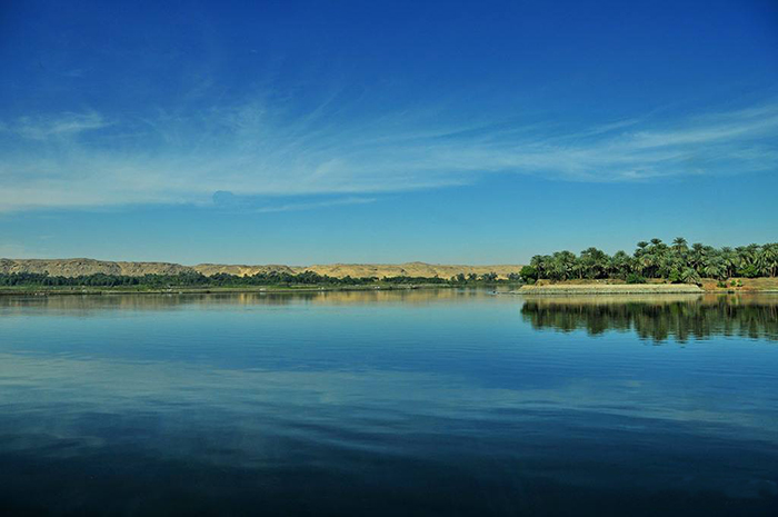 蜿蜒流淌的尼羅河,在黃色廣袤的沙漠中,猶如一條綠色的走廊,充滿著勃勃生機和無限希望。岸旁鬱鬱蔥蔥的灌木、連綿不絕的金黃色田野,在水中映出美麗的倒影,構成一幅如詩如畫的美麗畫卷。碧草茵茵,蘆葦搖曳,使人想起“蒹葭蒼蒼,白露為霜,所謂伊人,在水一方”的意境,想象著在氤氳的水氣中,一位佳人正款款走來。
