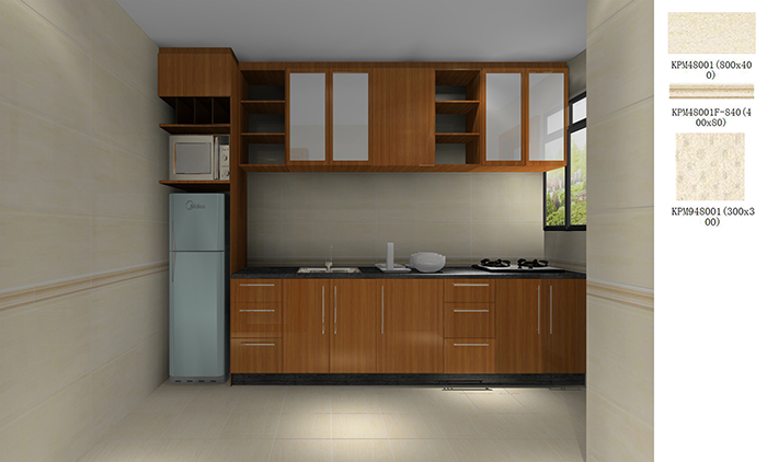 廚房:地板和牆麵延續了相同色調,所以櫥櫃做成了木紋色,顯得非常整潔。