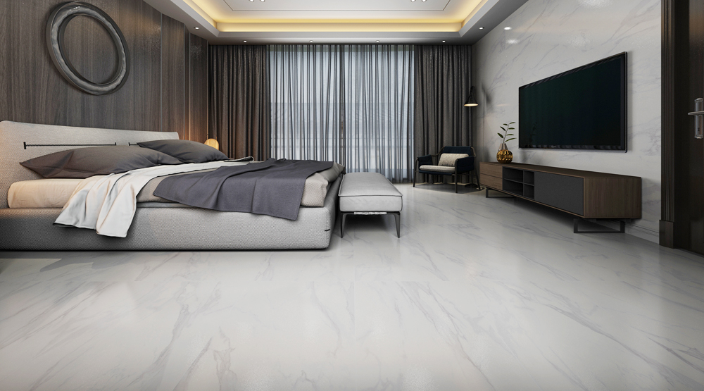 (15°緞光釉KFD126A01)錯位鋪貼的鋪磚方式,凸顯空間層次感,床尾配有布藝沙發,在窗邊看著這城市的日落和日出,一天都不會覺得枯燥。