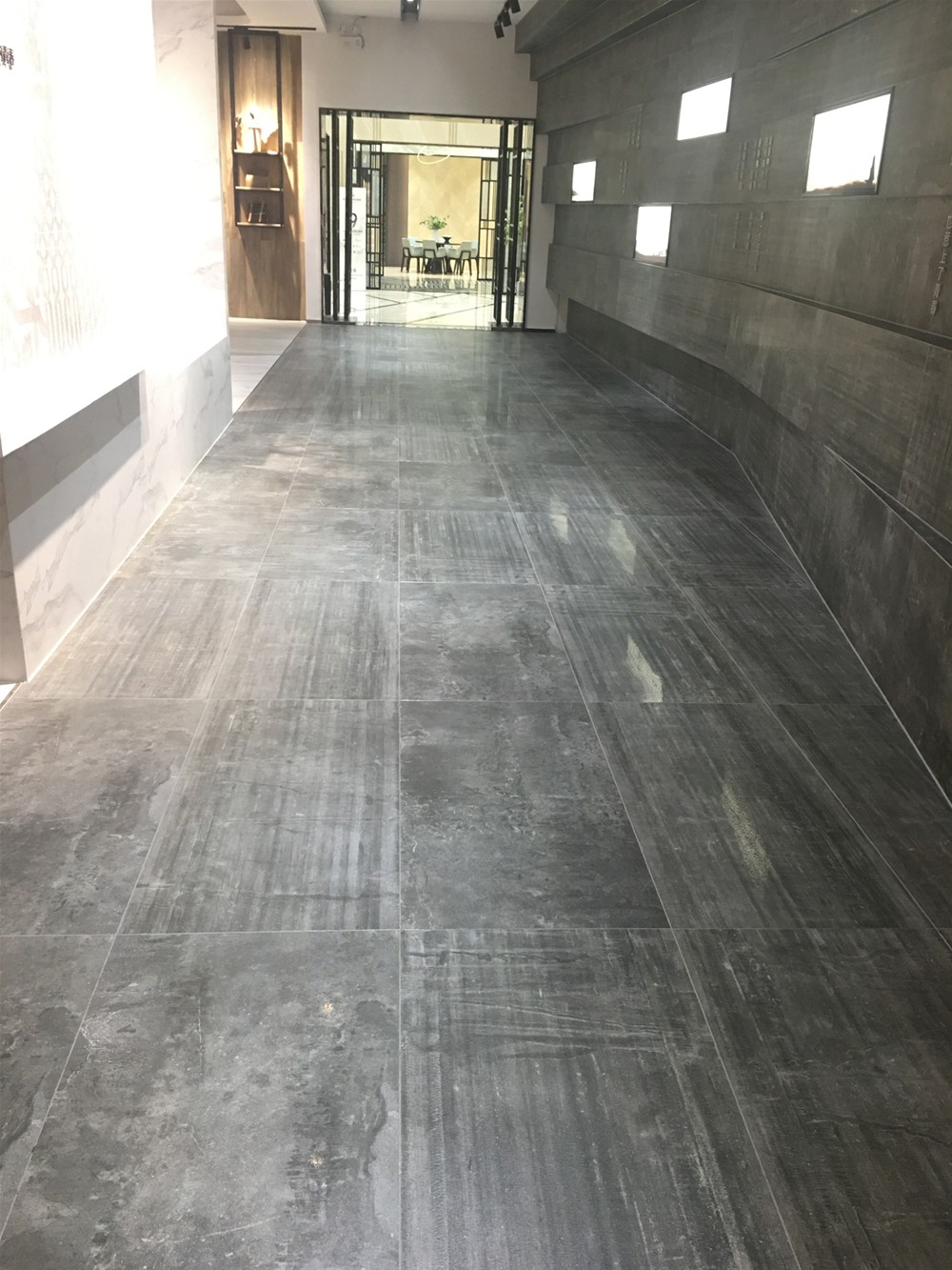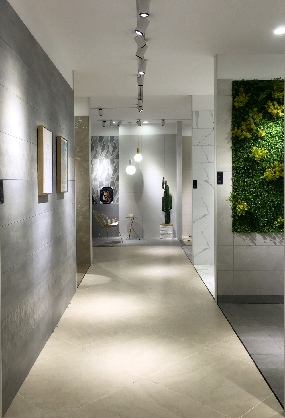 通常選用15°緞光釉、現代仿古磚、九麵通體大理石等多麵紋理變幻不一的瓷磚,簡約卻不單調。